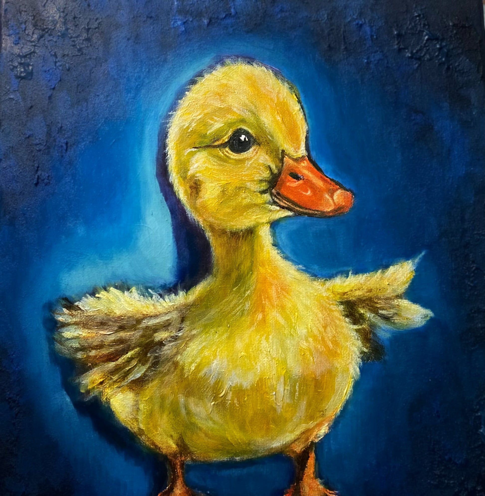 Bright, sweet, and full of charm, this adorable yellow duckling sits against a textured blue gradient background that makes its soft features pop. Perfect for adding warmth and a touch of whimsy to bedrooms, nurseries, study spaces, or art walls. A cute, cheerful print for anyone who loves animals, aesthetic décor, or simply wants a little joy on their wall.